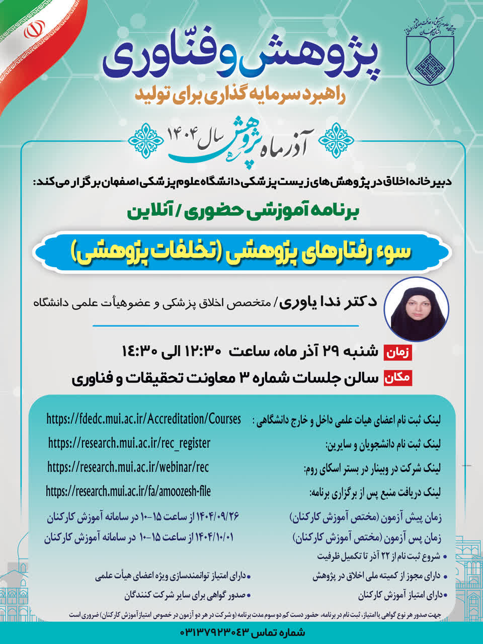 دبیرخانه اخلاق در پژوهش دانشگاه علوم پزشکی اصفهان برگزار می نماید: