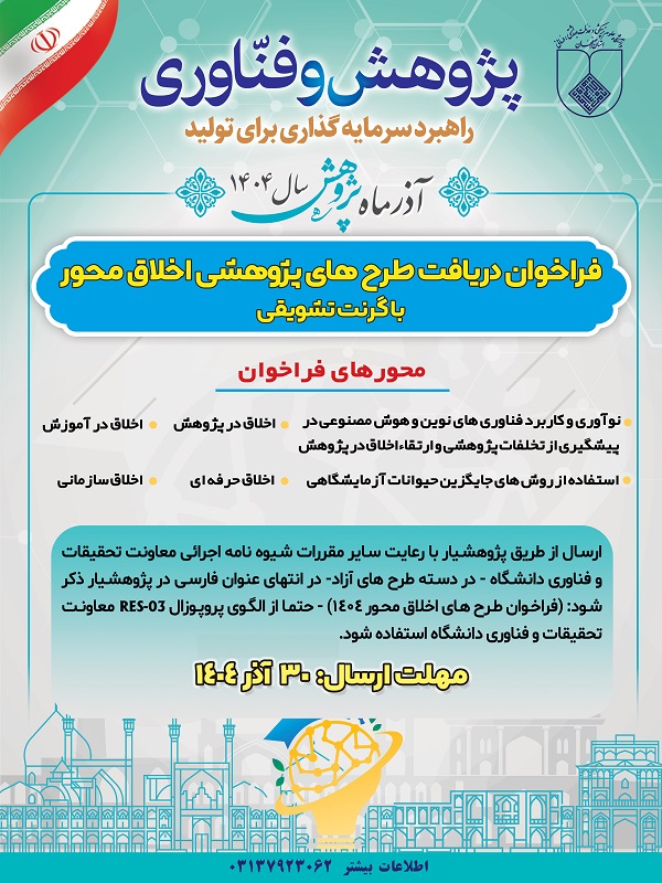 به مناسبت هفته پژوهش و فناوری آذرماه ۱۴۰۴، کمیته اخلاق در پژوهش دانشگاه اقدام به برگزاری فراخوان دریافت طرحهای پژوهشی اخلاقمحور با گرنت تشویقی کرده است.