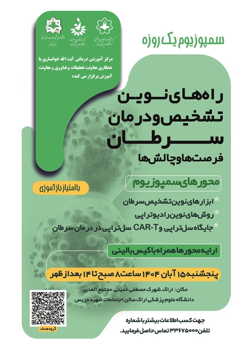 سمپوزيوم يك روزه راه هاي نوين تشخيص و درمان سرطان با امتياز بازآموزي و با محوريت ابزارهاي نوين تشخيص سرطان ،روش هاي نوين راديوتراپي و جايگاه سل تراپي و CAR-Tسل تراپي در درمان سرطان توسط مركز آموزشي درماني آيت اله خوانساري (ره) اراك و با همكاري معاونت تحقيقات و فناوري دانشگاه در تاريخ 15آبان ماه سال جاري در مجتمع الغدير دانشگاه علوم پزشكي اراك، سالن اجتماعات شهيد دريس برگزار خواهد شد .علاقمندان جهت كسب اطلاعات بيشتر مي توانند با شماره 08633675000تماس حاصل فرمايند .