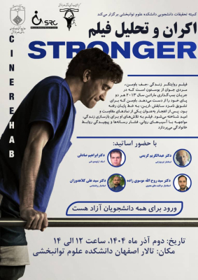 به اطلاع می رساند، در راستای برزگداشت آذرماه پژوهش کمیته تحقیقات دانشجویی توانبخشی (تریتا) با همکاری معاونت تحقیقات و فناوری دانشکده و مرکز تحقیقات اختلالات عضلانی و اسکلتی ، برنامه CineReahab را با هدف اکران و تحلیل فیلم سینمایی STRONGER محصول سال 2017 در روز یکشنبه مورخ 1404/09/02 ساعت 12:15 الی 14:30 در محل تالار اصفهان برنامه ریزی کرده است