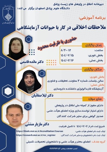 * برگزاری برنامه آموزشی "ملاحظات اخلاقی در کار با حیوانات آزمایشگاهی" 15 و 16 مهرماه 1404