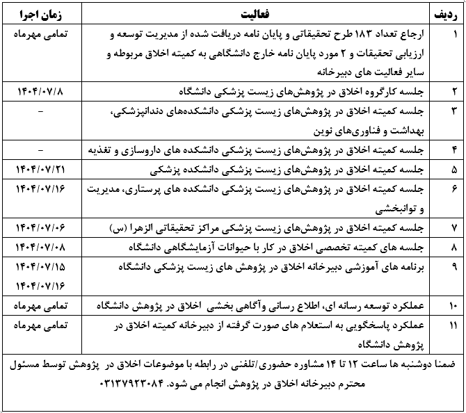 گزارش عملکرد دبیرخانه اخلاق در پژوهش های زیست پزشکی؛ مهرماه 1404