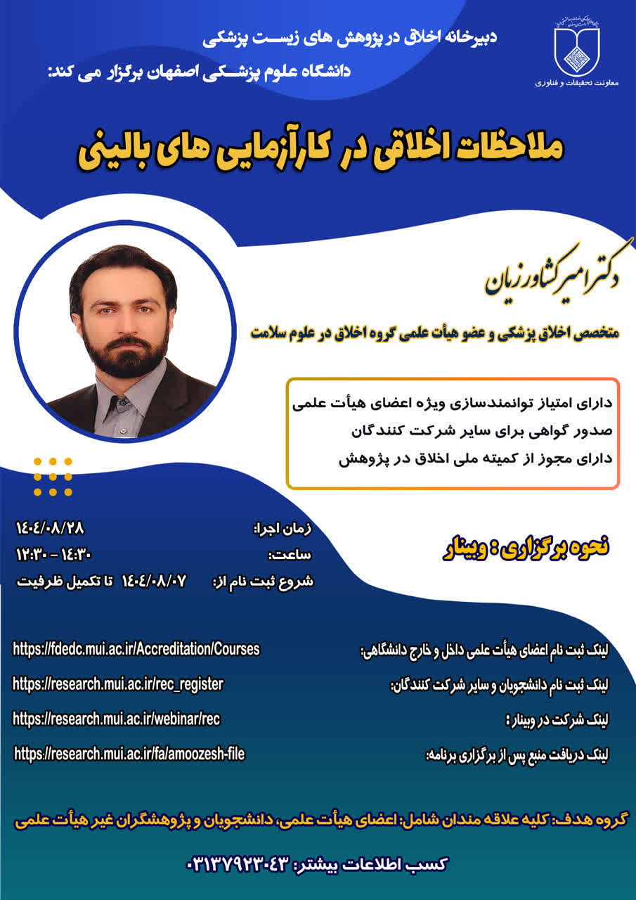 دبیرخانه کمیته اخلاق در پژوهش های زیست پزشکی دانشگاه، در راستای توانمندسازی اعضای محترم هیأت علمی و شنبه های اخلاقی، برنامه آموزشی با عنوان " ملاحظات اخلاقی در کارآزمایی های بالینی " از مجموعه وبینار " روش شناسی و ملاحظات اخلاقی در کارآزمایی های بالینی" را در تاریخ 28 آبان ماه 1404 از ساعت 12:30 تا 14:30 با تدریس جناب آقای دکتر امیر کشاورزیان متخصص اخلاق پزشکی و عضو هیأت علمی دانشگاه به صورت وبیناری برای گروه هدف دانشجویان تحصیلات تکمیلی، اعضای هیأت علمی، اعضا و کارشناسان کمیته های اخلاق در پژوهش و پژوهشگران غیر هیأت علمی برگزار نمود.