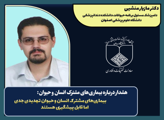 در ادامه سلسله گفتوگوهای علمی ترجمان دانش ، دکتر مازیار منشئی، متخصص جراحی دامپزشکی و پژوهشگر علوم دندانپزشکی، با اشاره به اهمیت بیماریهای مشترک میان انسان و حیوان(زئونوزها)، این بیماریها را تهدیدی جدی برای سلامت عمومی دانست و بر لزوم رعایت پروتکلهای حفاظتی در محیطهای آزمایشگاهی و جامعه تأکید کرد.