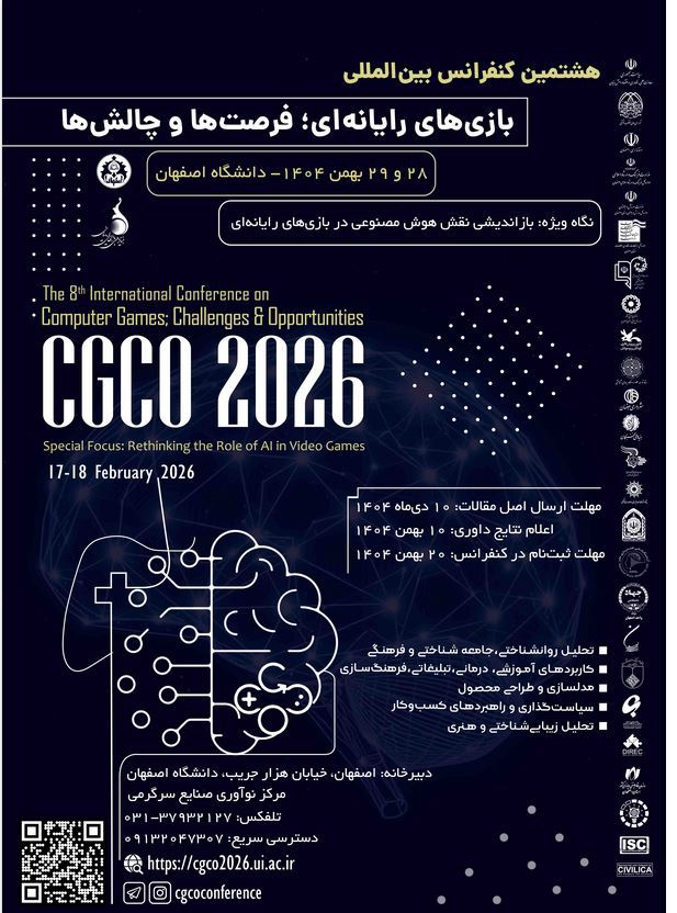 هشتمین دوره ی کنفرانس بین المللی «بازی های رایانه ای؛ فرصت ها و چالش ها» روز سه شنبه، 28 بهمن، 1404 لغایت چهارشنبه، 29 بهمن، 1404 توسط دانشگاه اصفهان, بنیاد ملی بازیهای رایانهای در شهر اصفهان برگزار می شود.با توجه به اینکه این همایش به صورت رسمی برگزار می گردد، کلیه مقالات این کنفرانس در پایگاه سیویلیکا و نیز کنسرسیوم محتوای ملی نمایه خواهد شد و شما می توانید با اطمینان کامل، مقالات خود را در این همایش ارائه نموده و از امتیازات علمی ارائه مقاله کنفرانس با دریافت گواهی کنفرانس استفاده نمایید.