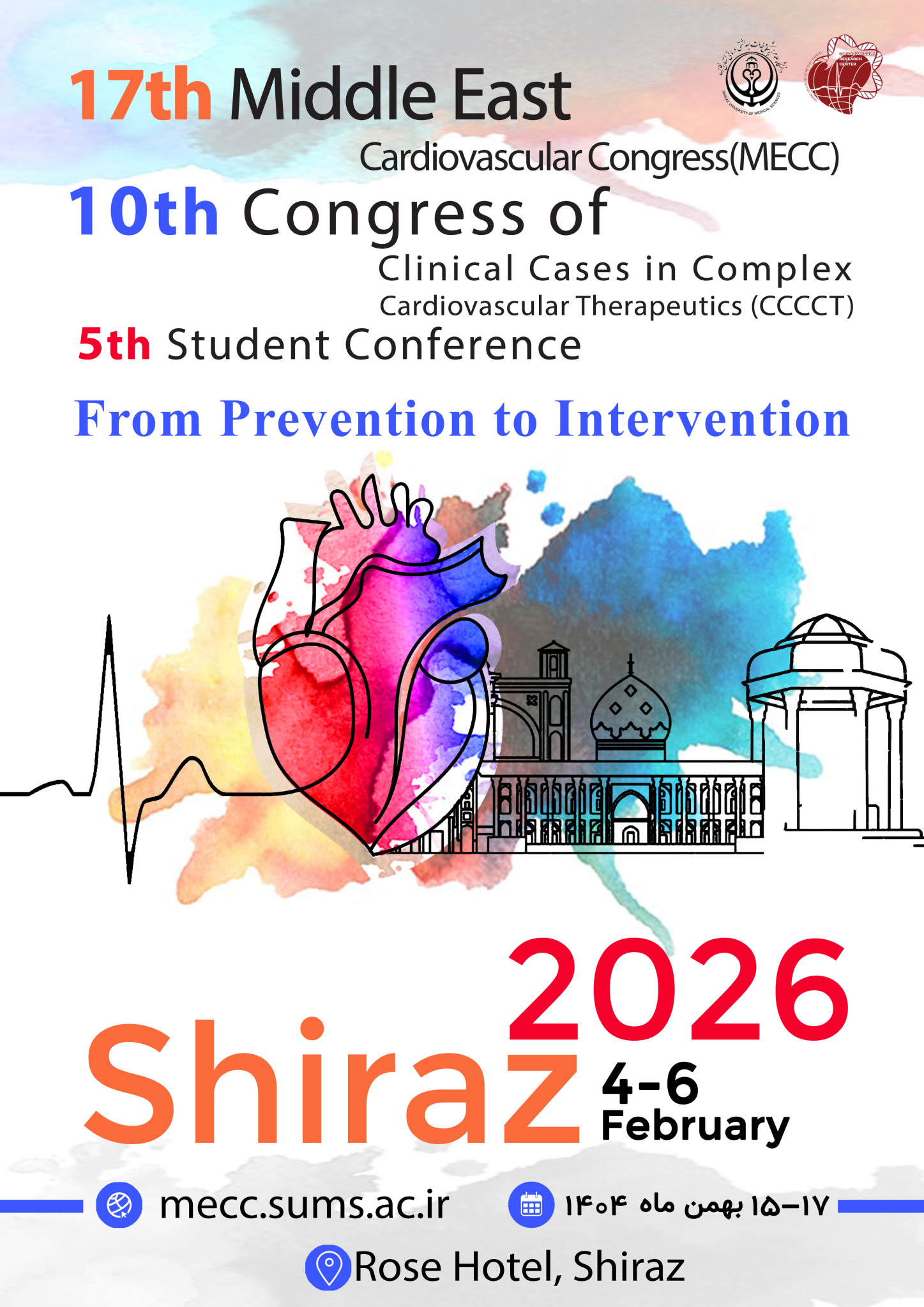 " هفدهمين كنگره بين المللي قلب خاورميانه و دهمين همايش مداخلات پيچيده قلبي همراه با پنجمين كنفرانس دانشجويي" از تاريخ  ۱۵لغايت  ۱۷بهمن ماه سال جاري برابر با  ۴لغايت  ۶فوريه سال  ۲۰۲۶در شهر صدراي شيراز (هتل بين المللي رز) برگزار خواهد گرديد.