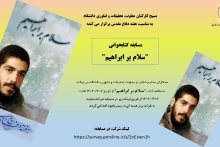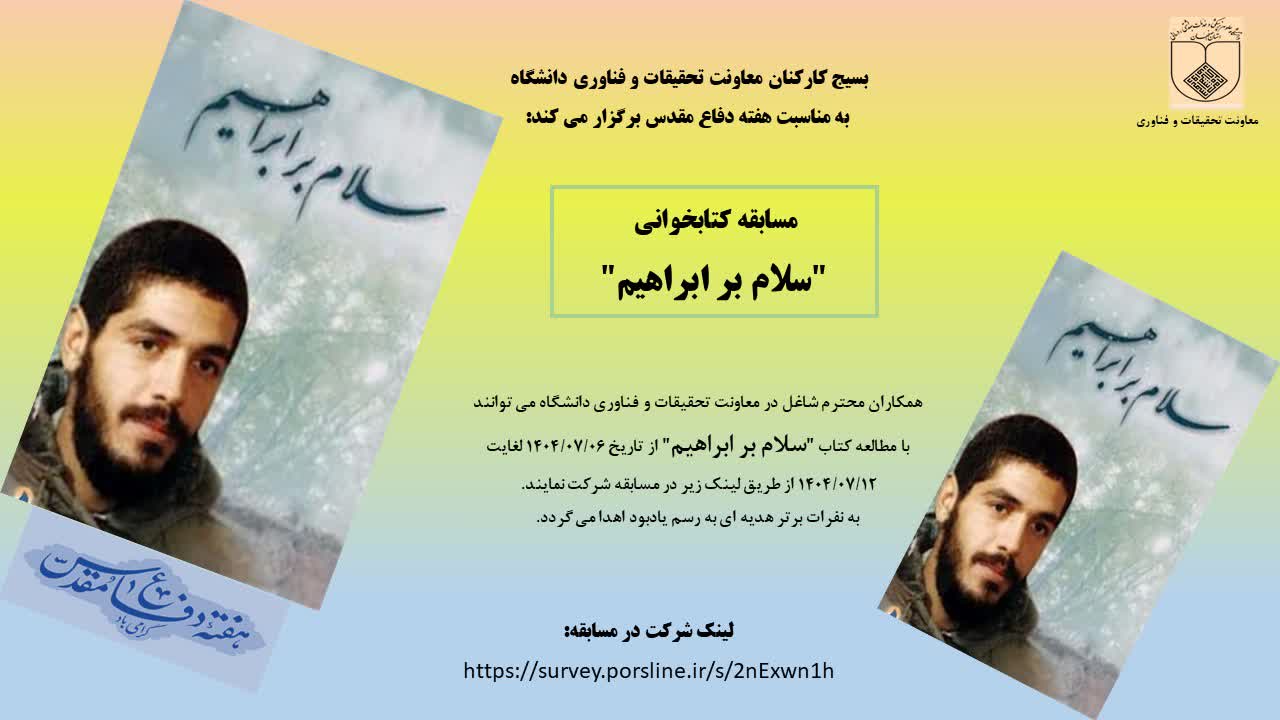 به همت واحد بسیج کارکنان معاونت تحقیقات و فناوری دانشگاه به مناسبت هفته دفاع مقدس، مسابقه کتابخوانی "سلام بر ابراهیم" با هدف ترویج فرهنگ مطالعه و آشنایی با سیره شهدای گرانقدر، به ویژه شهید ابراهیم هادی، برگزار گردید و درروز چهارشنبه، اول بهمن ماه به سه نفر از شرکتکنندگان ممتاز جوایز ی به رسم یادبود اهدا گردید.
