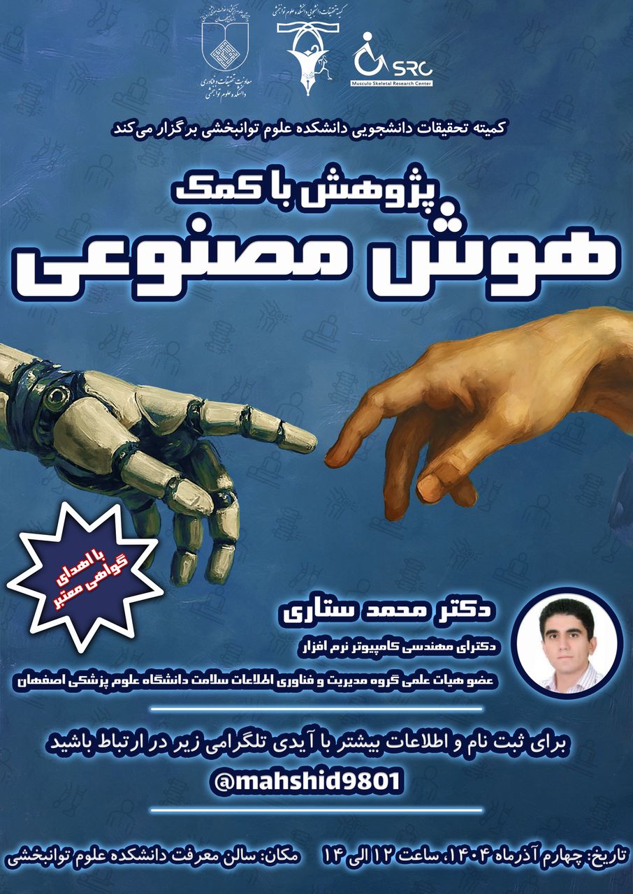 پژوهش با کمک هوش مصنوعی به استحضار می رساند کارگاه پژوهش با کمک هوش مصنوعی روز سه شنبه مورخ 1404/09/04 در دانشکده علوم توانبخشی، سالن معرفت از ساعت 12:00ـ14:00 با تدریس دکتر محمد ستاری برگزار خواهد شد.