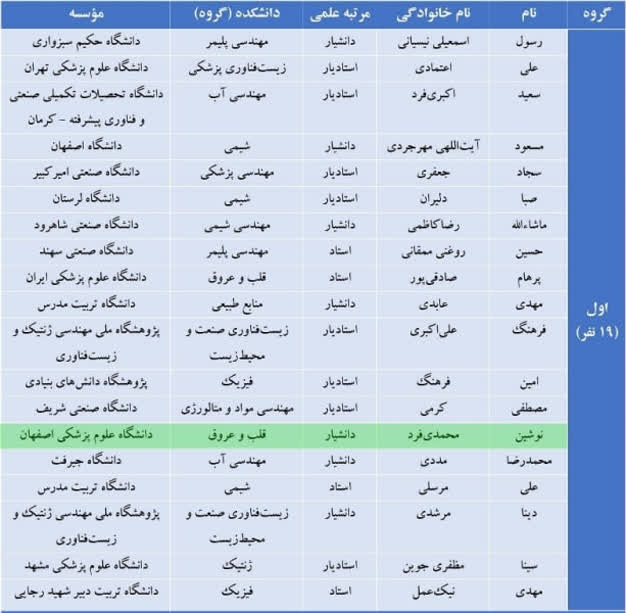 بر اساس نتایج اعلامشده، از میان این ۷۷ نفر، تنها ۱۶ پژوهشگر از دانشگاههای علوم پزشکی سراسر کشور حضور داشتند که نشاندهنده رقابت فشرده در این حوزه است. شایان ذکر است، دانشیار مرکز تحقیقات قلب و عروق، پژوهشکده قلب و عروق، دانشگاه علوم پزشکی اصفهان، در گروه الف (سرآمدان با بالاترین کیفیت آثار پژوهشی) قرار گرفت و بهعنوان یکی از برگزیدگان این دوره معرفی شد.