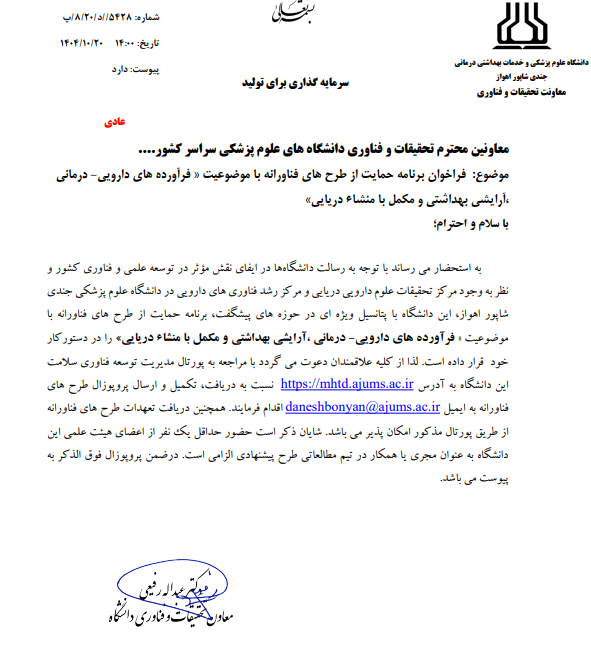 فراخوان برنامه حمایت از طرح های فناورانه با موضوعیت « فرآورده های دارویی- درمانی ،آرایشی بهداشتی و مکمل با منشاء دریایی»