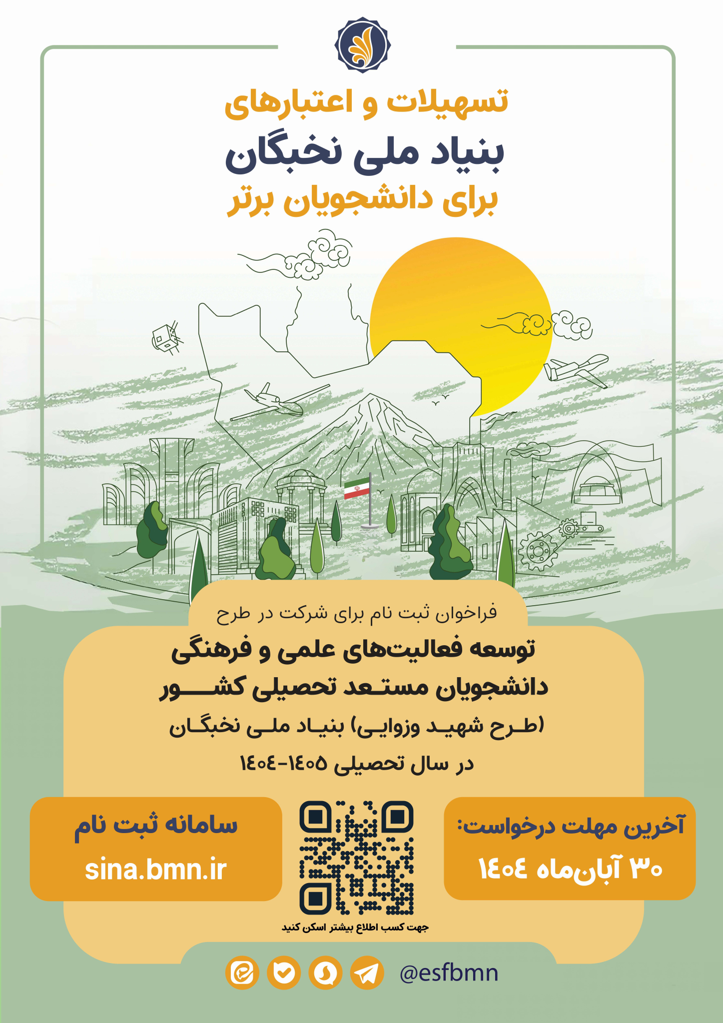 ثبت نام در این طرح از سوی بنیاد ملی نخبگان آغاز شده و تا تاریخ ۳۰ آبان ماه سال جاری ادامه دارد. دانشجویان عزیز میتوانند با ثبت نام در این برنامه از تسهیلات و حمایتهای علمی و فرهنگی بهرهمند شوند.
